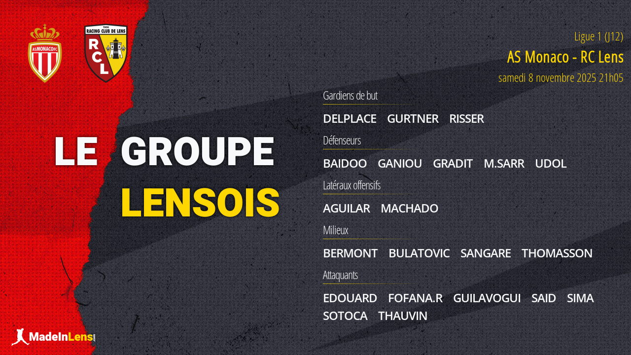 Voici le groupe de 21 joueurs sélectionnés par Pierre Sage pour le match AS Monaco - RC Lens prévu samedi.