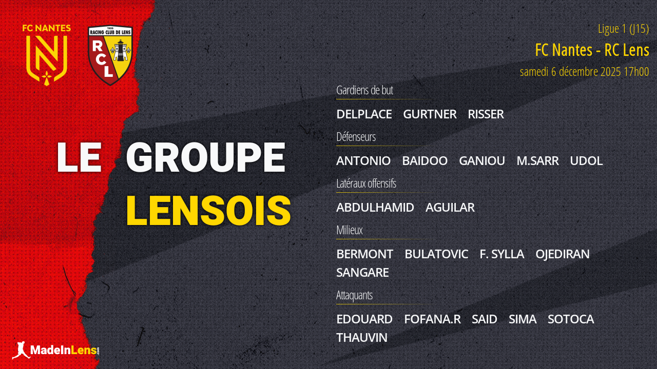 Voici le groupe de 21 joueurs sélectionnés par Pierre Sage pour le match FC Nantes - RC Lens prévu samedi.