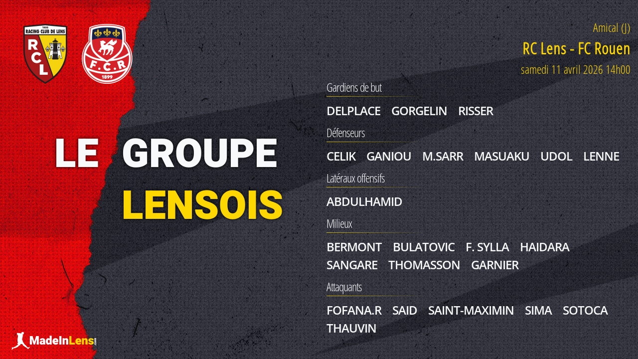 Voici le groupe de 23 joueurs sélectionnés par Pierre Sage pour le match RC Lens - FC Rouen prévu samedi.