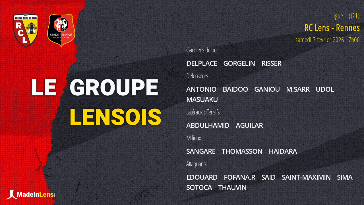 Voici le groupe de 21 joueurs sélectionnés par Pierre Sage pour le match RC Lens - Rennes prévu samedi. Samson Baidoo est de retour.
