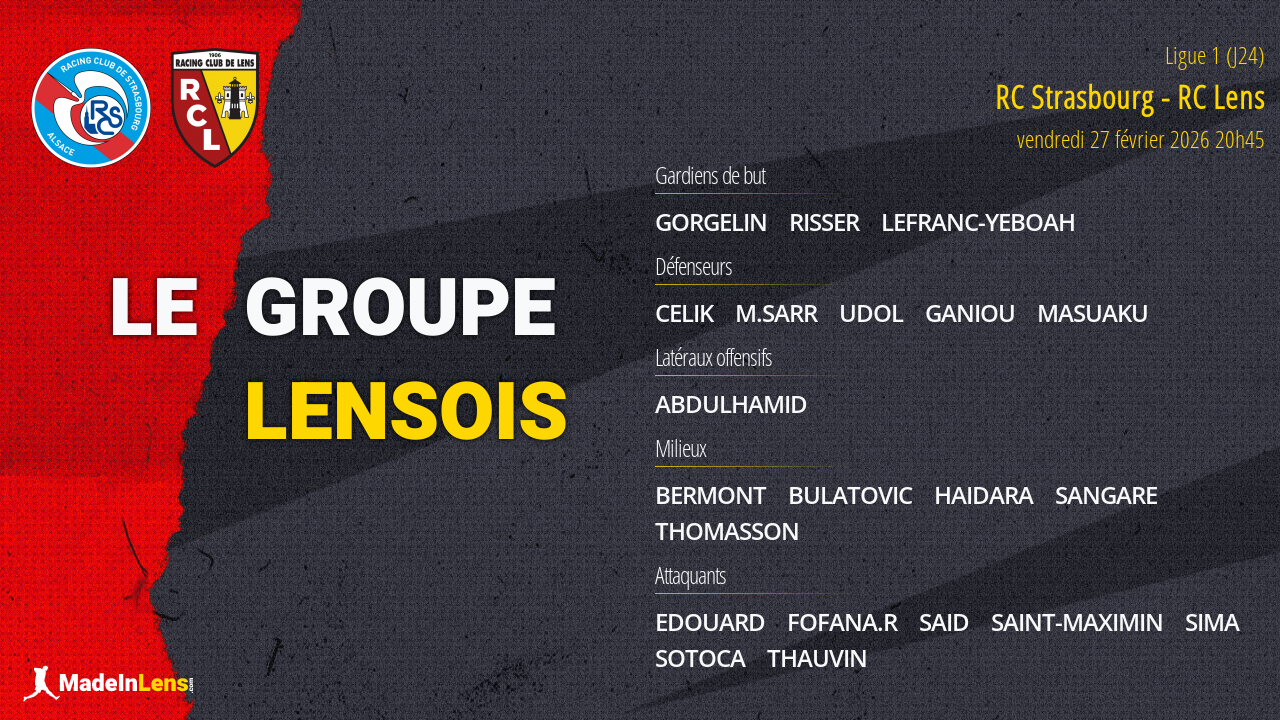 Voici le groupe de 21 joueurs sélectionnés par Pierre Sage pour le match RC Strasbourg - RC Lens prévu vendredi.