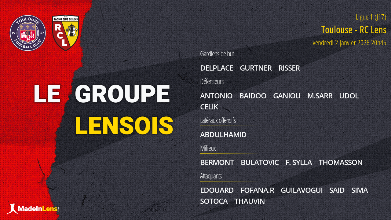 Voici le groupe de 21 joueurs sélectionnés par Pierre Sage pour le match Toulouse - RC Lens prévu vendredi.