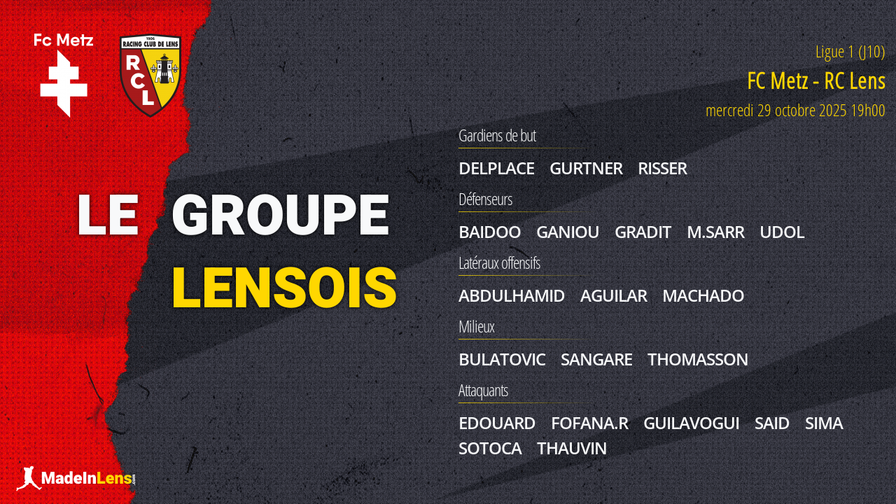 Voici le groupe de 21 joueurs sélectionnés par Pierre Sage pour le match FC Metz - RC Lens prévu mercredi.
