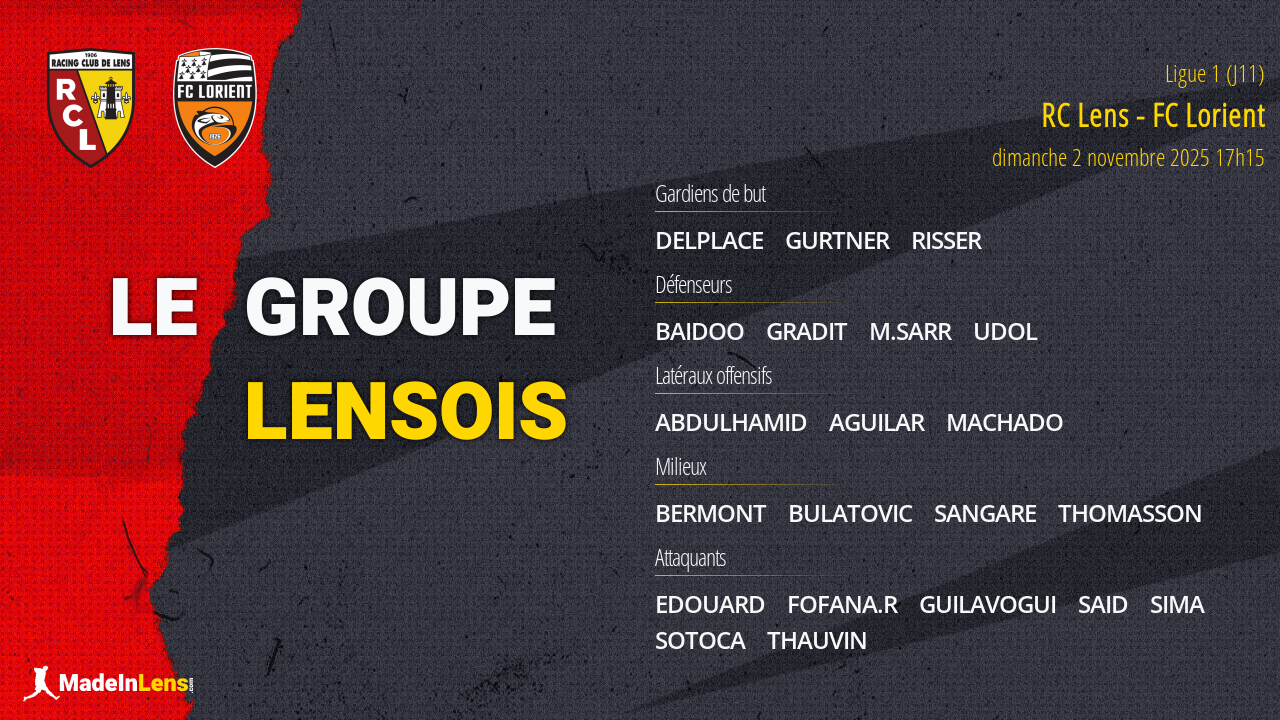 Voici le groupe de 21 joueurs sélectionnés par Pierre Sage pour le match RC Lens - FC Lorient prévu dimanche.